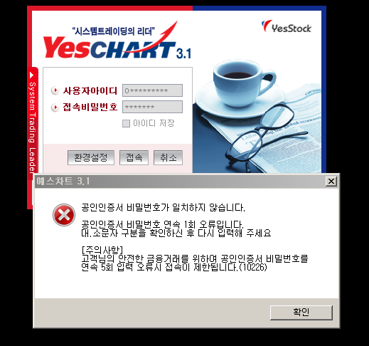 예스차트3.1 아이디, 비밀번호 정확히 입력 후 접속 실행시키면 공인인증서 비밀번호가 틀린다고 하면서 안 열려요. 빨리 조치 좀 해주시면 감사하겠습니다.