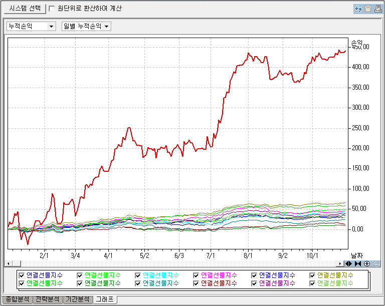 포트폴리오의 종합보고서에서는 각 시스템의 개별 '거래건별'로 집계된 자료를 보여주고 있습니다. 각 시스템의 진입과 청산시점이 다르고 하루에도 여러번 신호가 발생될 수 있으므로 문의하신 것처럼 동시에 매매되는 상황에서의 포트폴리오의 성과를 확인할 수 있는 방법은 없습니다. 거래건별이 아닌 일별로 집계한다면 가능하겠지만, 예스트레이더의 성과보고서가 거래건을 기준으로 하고 있기 때문에 이 분을 변경해 드리기도 어려울것 같습니다. 해당 내용은