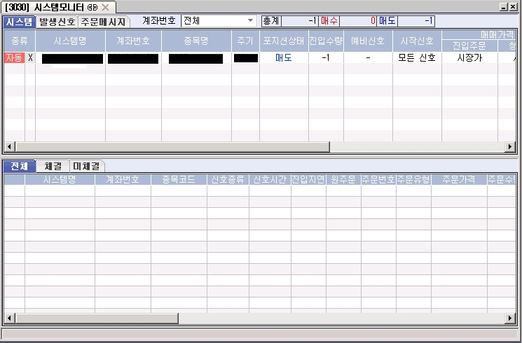 전체, 체결, 미체결은 자동매매 실행 이후의 자료에 대해서만 보여주며, 재접속을 하실 경우에는 기존 내용이 모두 삭제됩니다. 따라서 실제 계좌상태와는 일치하지 않고, 자동매매를 수행한 이후에 재접속 하기 이전까지의 자료만 나타냅니다.