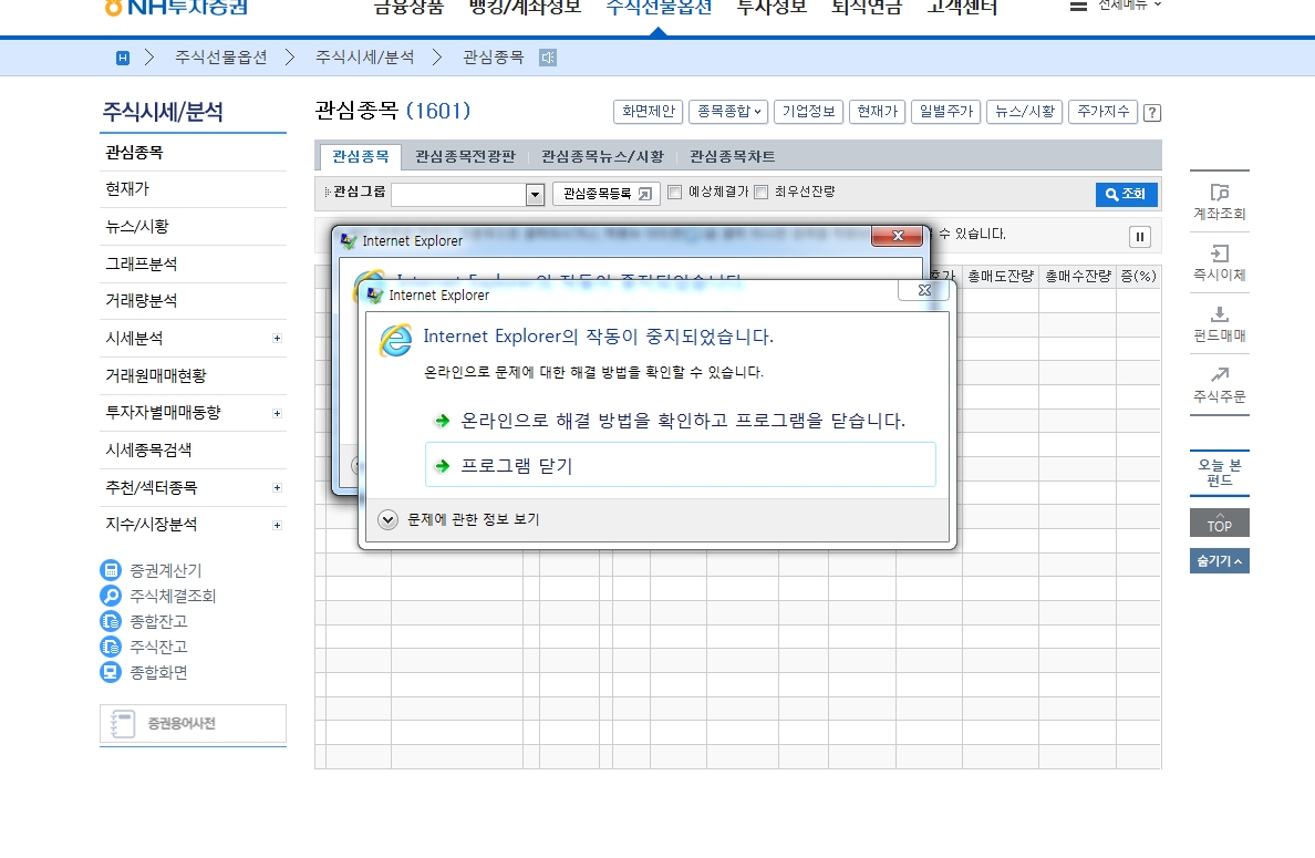 홈페이지에서 해당 오류가 뜬다면 NH투자증권 콜센타(1544-0000)로 확인해 보셔야 할것 같습니다.