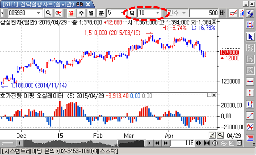 1. 위 그림이 선물옵션거래 오실레이터라고 가정하면, 위쪽 빨간점선으로 표시된 부분을 보시면, 만약 제가 "틱"을 150으로 바꾸면 오실레이터차트가 어떤 기준으로 보여주게 되는 걸까요? (즉, 오실레이터 각 점이 찍히는 기준을 의미 합니다)