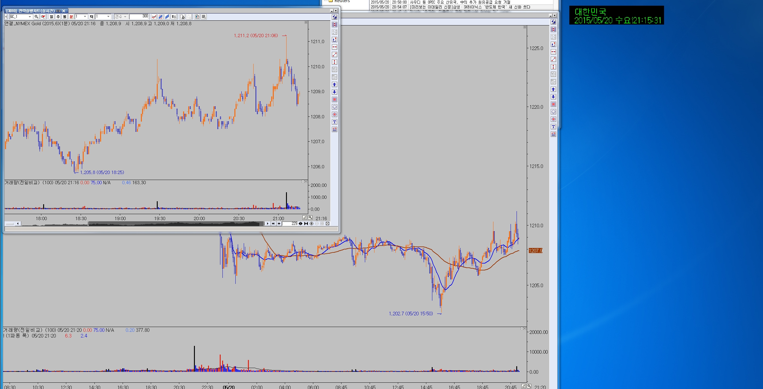 첨부한 그림과 같이 예스글로벌 연결지수 골드 1분봉과 5분봉차트에서
