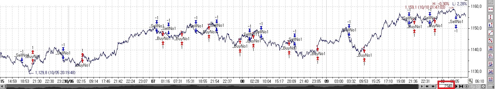 정확한 시뮬레이션을 시키려 해도 10일전에는 수익률이 확 증가하다가 나중에는 봉 표시가 적어서 그런지 수익표시 이상하게 변경됩니다. 제 기억에는 4000봉이 넘었는데 왜 갑자기 축약되서 나타나는지 모르겠네요. 이거땜에 차트의 왜곡이 생겨서 정확한 수익을 잡기 힘드네요.