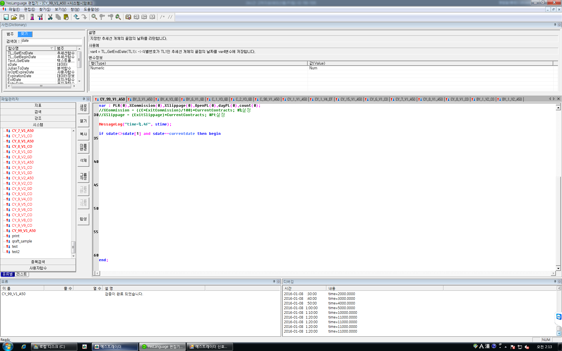 현대선물에서 해외선물 FTSE a50 10분봉 실시간 차트에서 messagelog 함수를 써서 분석작업을 하고 있습니다.