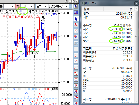 데이터 보기 창에서 표시해 놓으신 내용은 현재봉의 시가와 현재봉의 종가 차이 이므로