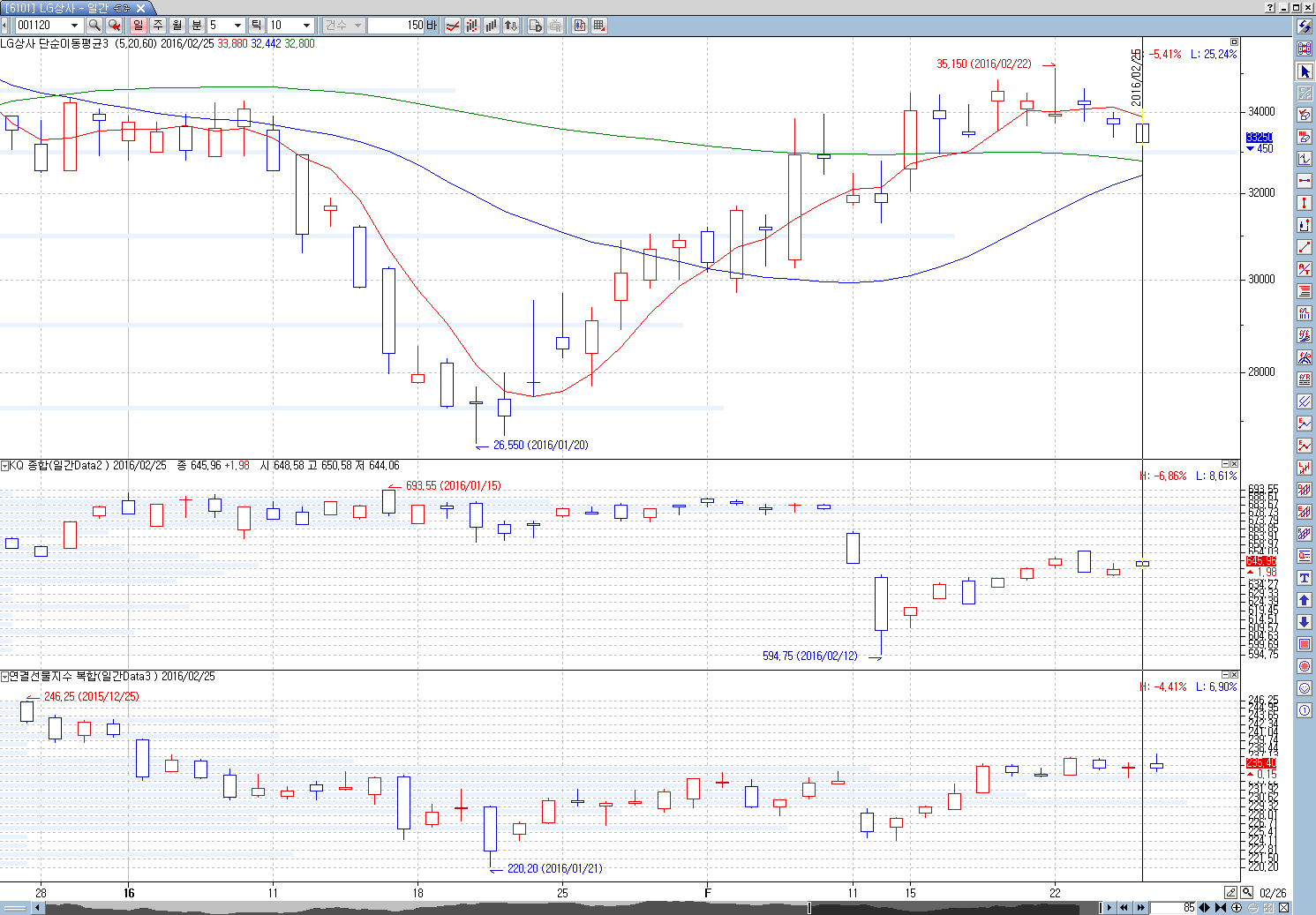 > 주식차트에서 선물지수를 불러오면 봉의 간격이 벌어지며 일봉의 수직라인도