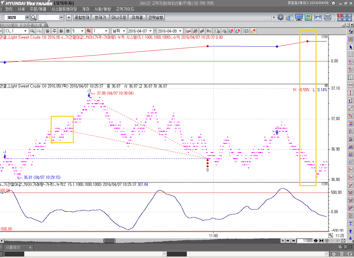문의하신 내용은 틱차트를 사용하실 경우 동일한 시간에 여러개의 데이터가 들어오게 될 경우에 해당 봉에서 매매신호가 발생하게 되면, 데이터 겹침 현상 때문에 신호가 숨겨지는 현상이 나타날 수 있습니다. 말로 풀어서 설명드리기가 어려운 부분인데, 이에 대해서는 근본적인 해결이 어려운 것으로 판단하고 있습니다. 도움되는 답변을 드리지 못해 죄송합니다.