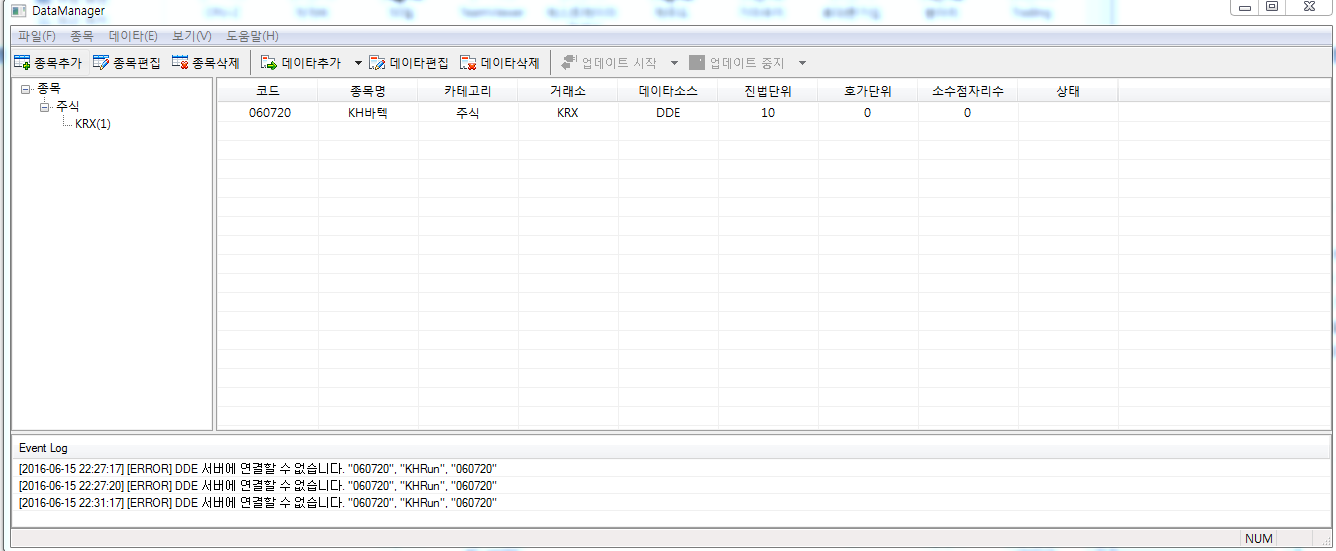 그 다음 데이터매니저의 '데이터추가'를 클릭하셔셔 'DDE불러오기' 창이 나오면,