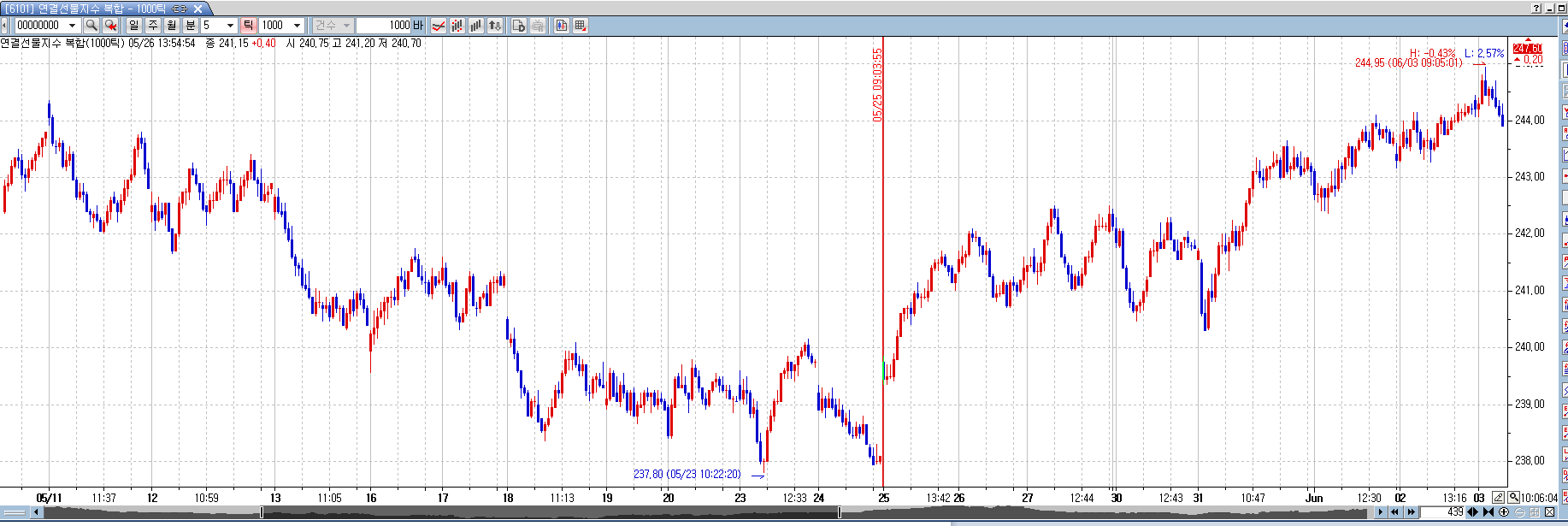 약 1월 이전(위 그림의 수직선 이전)의 틱차트부터는 야간봉틱차트가 생성이 되지 아니합니다.