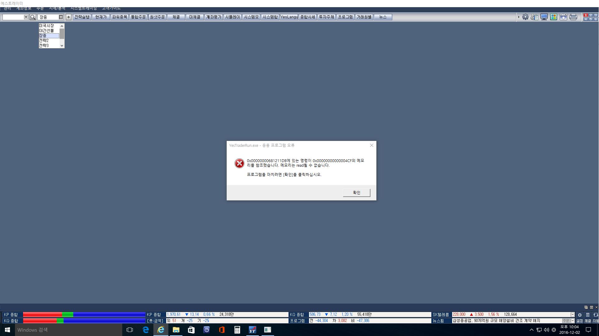 메시지 내용으로 볼때 호환성 문제는 아닌것으로 보이고, 메모리 보호 모듈의 충돌 문제인것으로 판단이 됩니다. 정확한 확인과 해결을 위해서는 원격지원으로 확인해 드려야 될것 같습니다. 시간 되실때 예스스탁(02-3453-1060:박상우 팀장)으로 연락 주시면 원격으로 확인해 드리도록 하겠습니다.