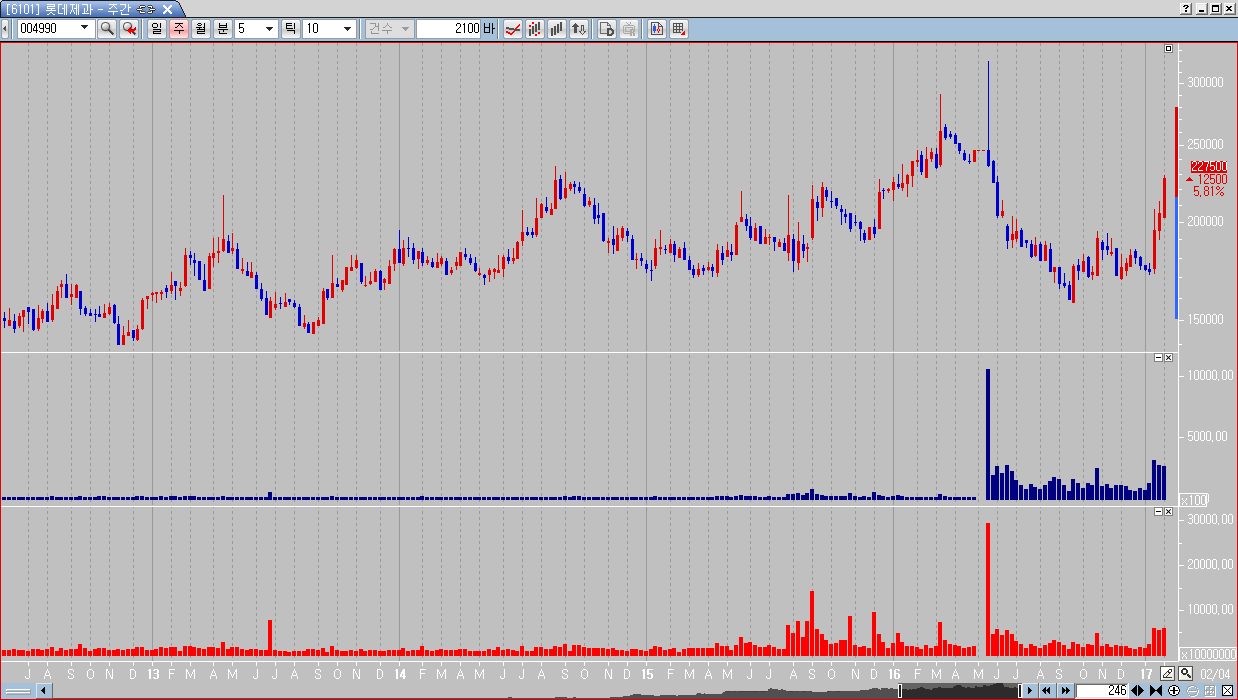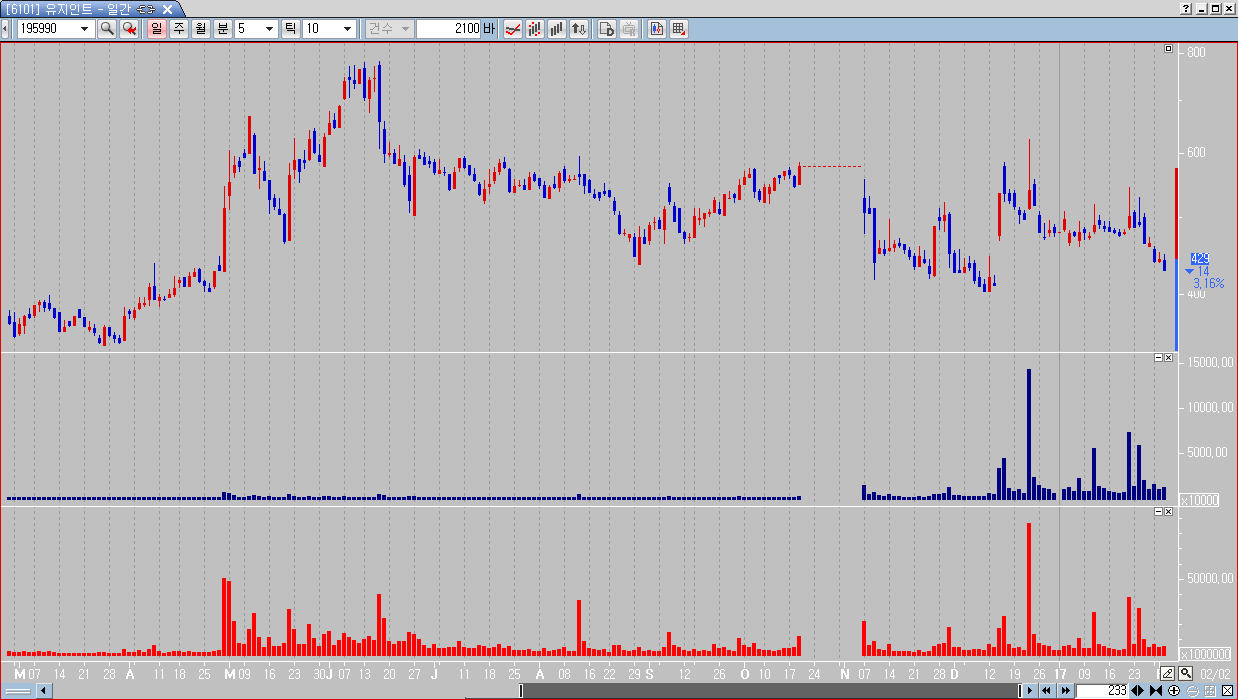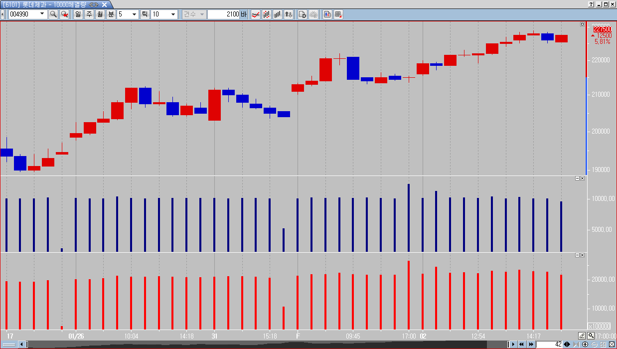2. 균일거래량별 봉분할 기능으로 말씀해주신 '체결량'에 따라 차트를 보는 기능을 살펴보았지만, 너무 한정적인 기간이 나왔습니다. 적어도 몇 년 치 차트를 볼 수 있어야만 일반적 종목의 차트 분석이 가능합니다. 이 기능의 성능 개선을 건의드립니다. 좀 더 많은 기간 출력이 가능하였으면 합니다. 역시 첨부파일로 넣어드립니다. 아마 제 생각엔 틱차트의 데이터를 참조하여 차트를 만들어주는 것 같습니다. 긴 기간으로 보고자할 땐 그에 상응하는 기간의 차트 체결량을 참조하면 어떨까 싶습니다.