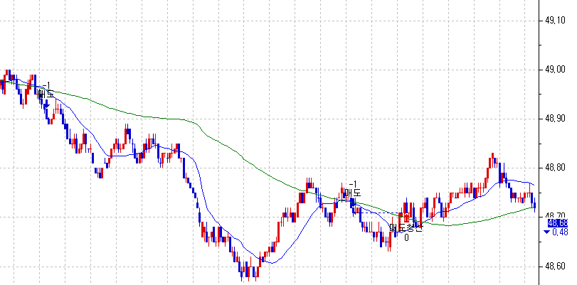 왼쪽에 -1 매도 계약후에 0.1포인트 이상 수익이 발생하는 구간에도 청산 표식이 나타지 않습니다.