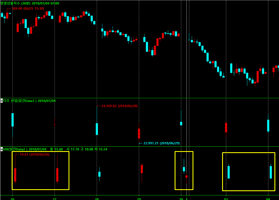 어떤날에는 vix 일봉 두개가 똑같이 나오고 다우지수와 날짜가 맞지 않습니다.