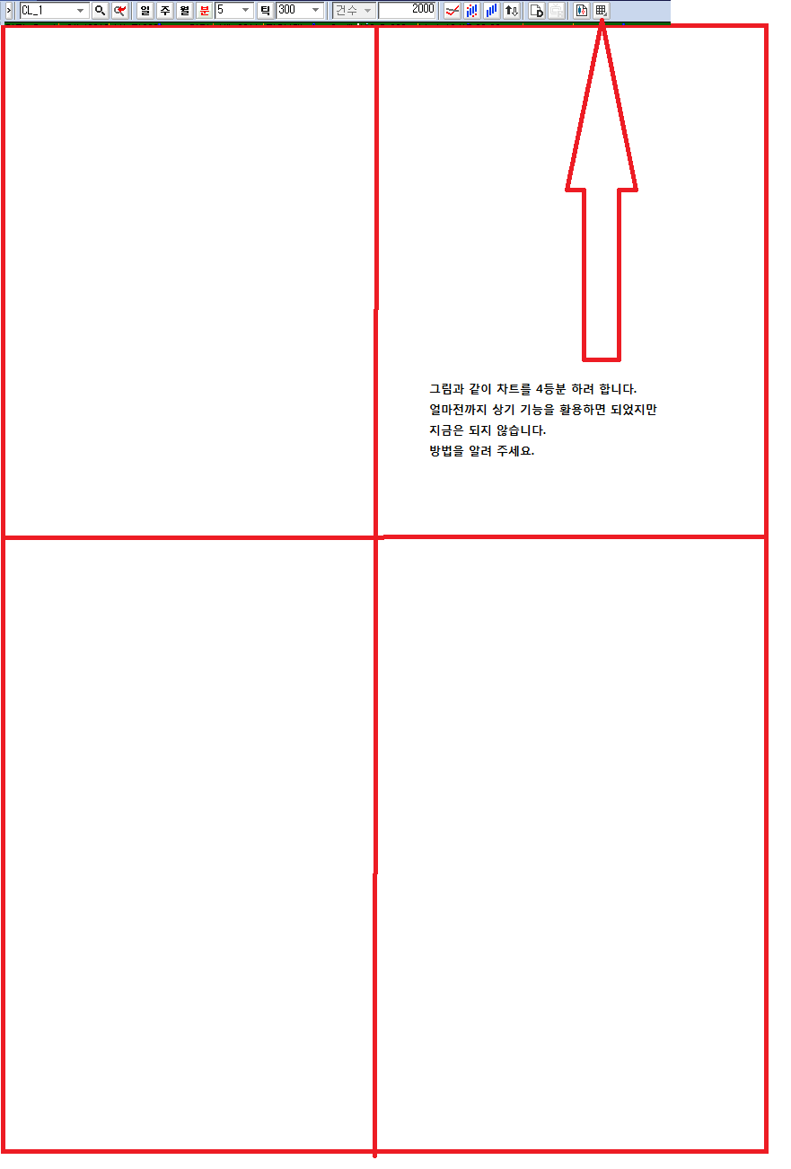 차트분할 파일이 삭제되지 않으셨다면 말씀하신 버튼(차트분할 선택)을 클릭해서 나오는 '수직수평분할(2*2)'를 클릭하시면 4개 영역으로 화면이 분할 됩니다.
