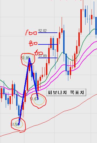 피보나치 목표치라고 위과 같이 키움이나 다른 프로그램 차트에 있는 기능입니다.
