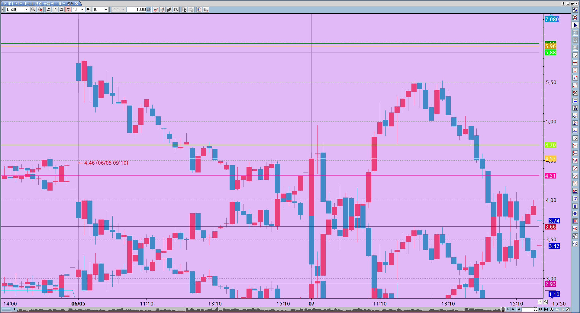 교차차트로 6개정도 콜/풋 행사가를 겹쳐보았는데