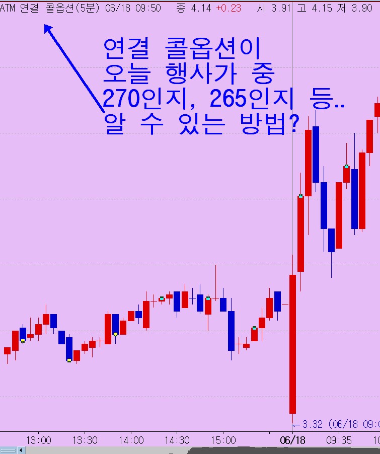 단점은 aTM콜옵션이 등가격인건 알겠는데 행사가가 270인지,, 267인지 바로 감이 안잡힌다는 것입니다.