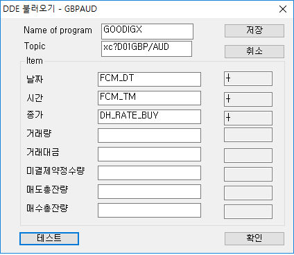 저희가 제공하는 데이터매니저에서는 일반적인 형태의 DDE 이터 처리를 지원해드리고 있는데, DDE데이터를 제공하는 곳마다 약간씩 차이가 있는 경우, 해당 DDE로부터 값을 직접 받지 못하는 경우도 생깁니다. 저희가 타프로그램의 DDE처리 구조를 정확히 알 수 없기 때문에 이에 대해 문제 해결을 해드리기 어려운 점 양해부탁드리겠습니다. 부득이 엑셀을 경유하는 방법으로 사용하셔야 할것 같습니다.