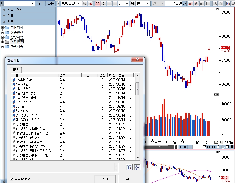 그림에서 보시는 바와 같이 전략실행차트에서 검색선택을 통한 패턴분석 결과를 보고자 합니다. 현재 활성화 된 부분은 적용이 가능하나 비활성화 된 부분(회색처리된 검색)은 적용되지 않네요. 왜 그런것일까요?? 적용 방법에 대해 안내 부탁 드립니다.