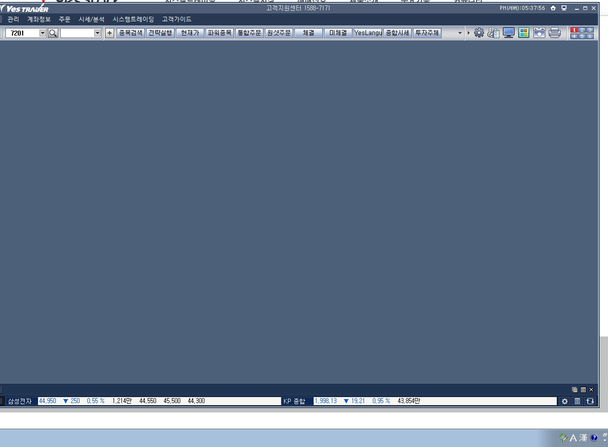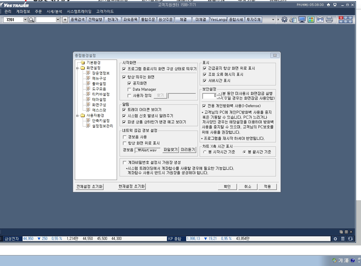그리고, 환경설정에서 프로그램 종료시 화면구성 상태로 띄우기에 체크해 놓으셨다고 하셨는데, 왜 이 부분이 정상 작동하지 않는지는 원격지원으로 확인해 보아야 알 수 있을것 같습니다. 말씀드린 화면틀 보관하기 기능을 사용해 보시고, 여전히 재접속시 빈화면으로만 올라온다면 예스스탁으로 연락을 부탁드리겠습니다.(02-3453-1060:프로그램사용법Q&A담당자)