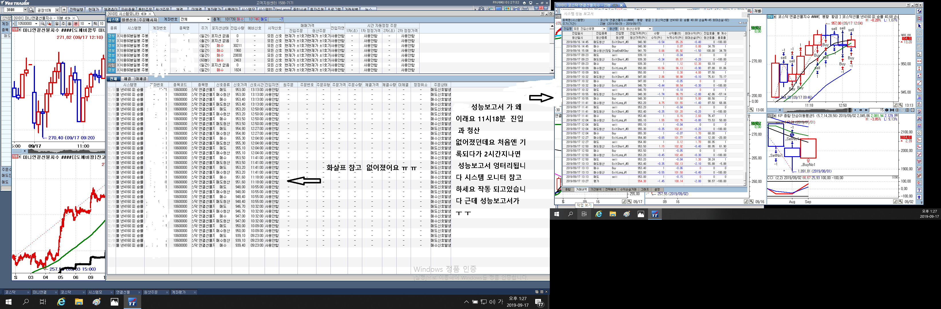 23분 코스닥선물 한봉에 종가 대비 에서 한번 진입후 종가대비에서 한번더 진입하는방식 인데요 성능 보고서 처음엔 문제없이 잘 작동 정상적으로 보여주더니