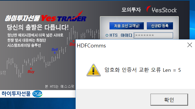문의하신 내용처럼 로그인시 해당 오류 화면이 뜨는 경우가 있는데, 다시 로그인 하시면 정상적으로 처리되는 경우가 있습니다. 혹시 동일한 현상이 계속 발생된다면 하이투자선물에 문의를 해보셔야 할것 같습니다. 저희 예스스탁에서 확인해 드리지 못하는 부분이라서 명확한 해결 방법을 말씀드리지 못하는 점을 양해 부탁드리겠습니다.
