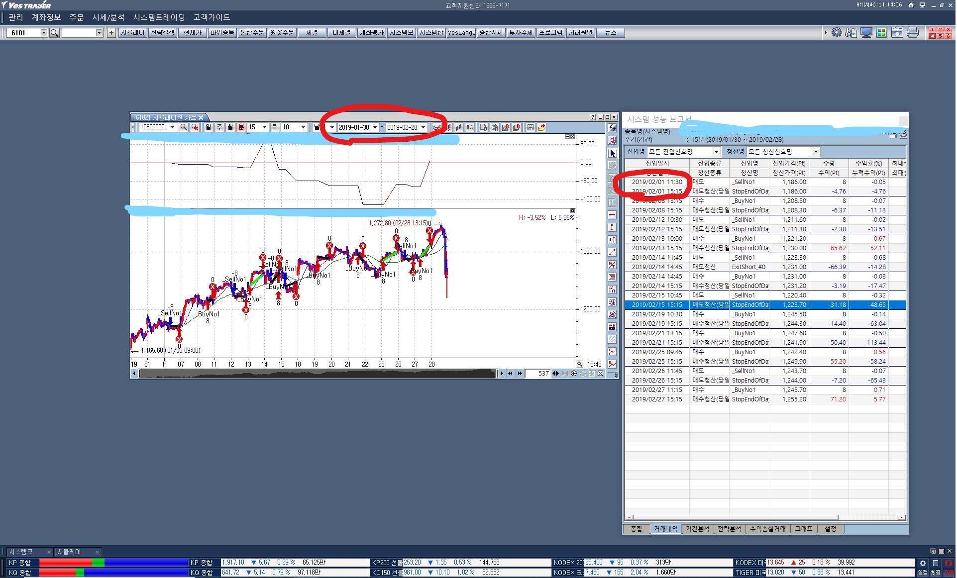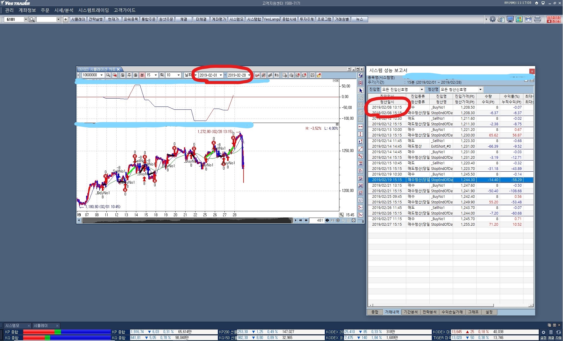 - 15분봉 및 당일청산 조건으로 매월 시뮬레이션차트의 성능보고서를 검토하고 있는 중임.