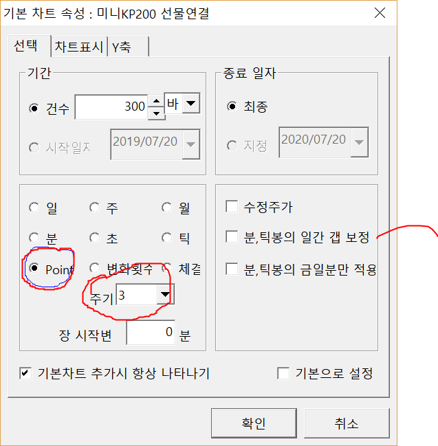 예를 들어 호가 단위가 100원씩 변동되는 종목인 경우에 '주기'에 3을 입력하게 되면