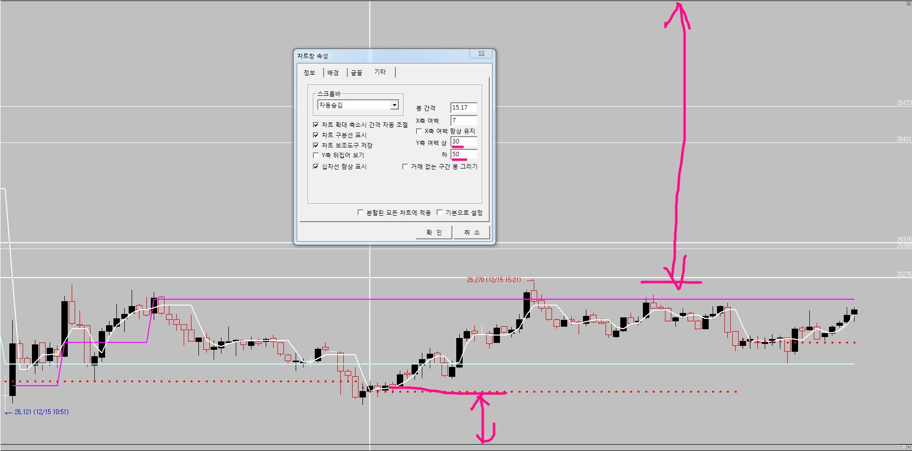 차트에서 캔들 수를 줄여 확대해도 상하 여백 넓이가 좁혀지지 않습니다.