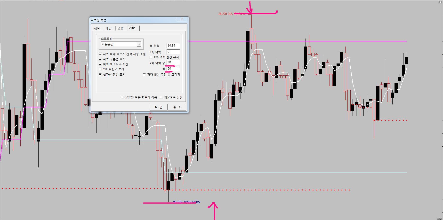 > 차트에서 캔들 수를 줄여 확대해도 상하 여백 넓이가 좁혀지지 않습니다.