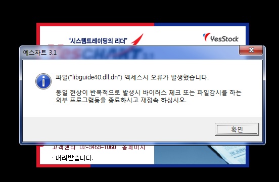 특정 보안 프로그램과의 충돌 때문에 발생되는 문제로 판단되는데, 예스차트를 실행하실 때 작동중인 보안프로그램을 종료하신 후에 접속해 보시기 바랍니다.