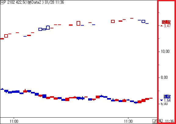 위 그림은 콜풋교차챠트로서 빨간선 박스부분에서 콜풋봉의 가격이 실시간으로 나타나는데요