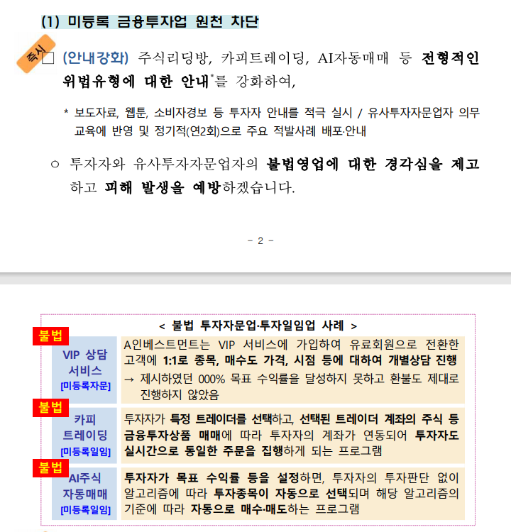 중간에 보면 미등록 금융투자업을 원천 차단하려고 AI주식 자동매매를 불법으로 지정했는데요,