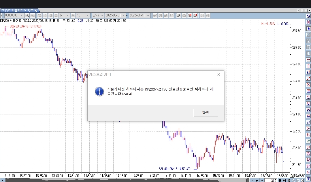 시뮬레이션 차트에서는 1분 미만의 차트(틱차트, 초차트)의 경우는 KP200선물과 KQ150선물에서만 제공되고 다른 종목이나 참조종목에서는 제공되지 않기 때문에 해당 메시지가 나옵니다.