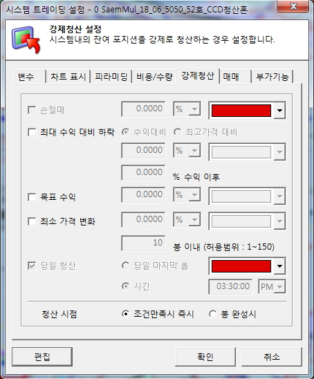 시스템식 로직 안에 당일청산(setstopendofday)이 사용되었기 때문에 시스템트레이딩 설정창에서 비활성된 것입니다. 시스템식에서 당일청산을 삭제하시면 설정창에서 사용 가능합니다.