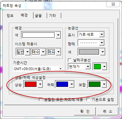 차트창 속성에서 상승하락 색상설정 기능 문의