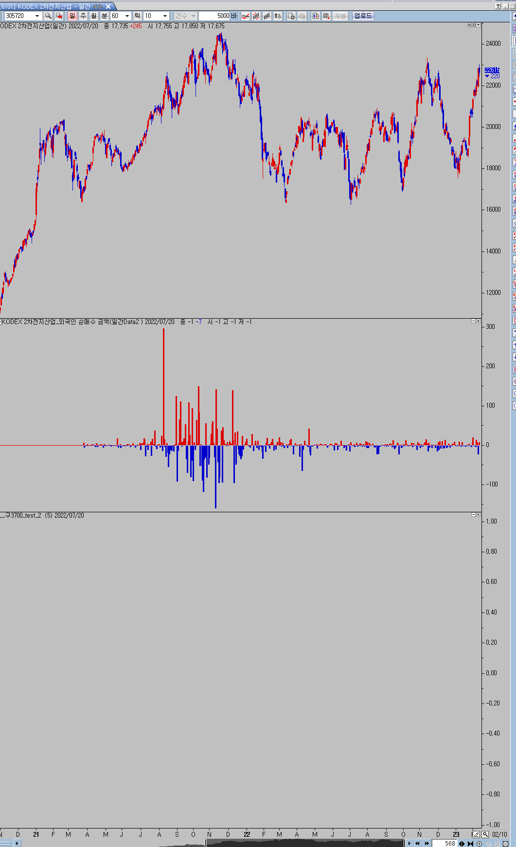 올려주신 이미지의 내용대로 차트(Kodex 2차전지산업) 구성해서 올려주신 지표식 복사해서 적용해 보았는데 정상적으로 출력되는 것을 확인하였습니다.