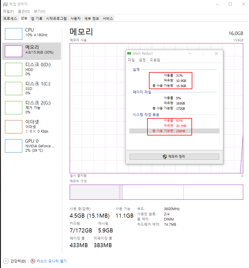 3)현재 램16으로 사용중인데, 메모리 사용 체크시 그림과 같이 사용량이 몰리는 경우가 있읍니다. 가상메모리를 확장했고 기타 플그램사용을 자제해도 가끔 최악의 경우가 이렇읍니다. 64기가로 늘리면 시스템 메모리가 확장되는지 궁금합니다