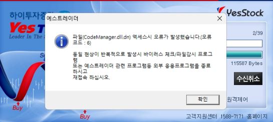 예스트레이더 프로세스가 종료되지 않아서 발생되는 현상일 수도 있습니다.