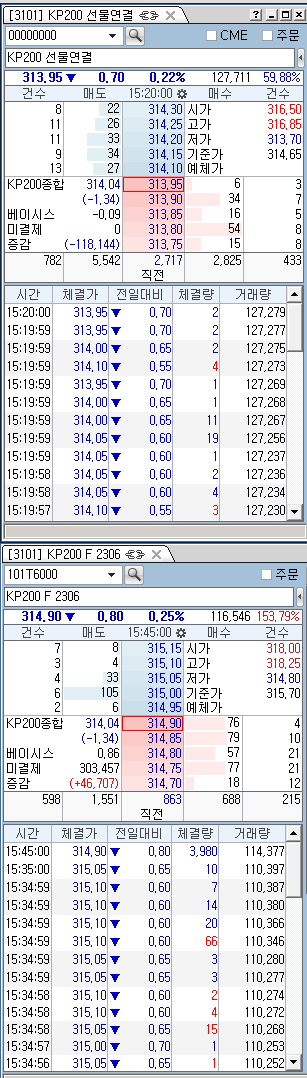 만기일인 23.03.09일의 연결선물지수[000000]와 선물 6월물인 F2306의 지수 값이 다른데