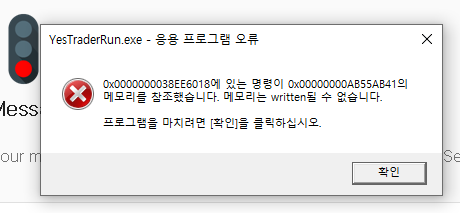 해당 메시지는 사용 가능한 메모리 용량을 초과하는 경우에 프로그램이 종료되며 발생되는 메시지입니다. 예스트레이더 32비트 프로그램에서는 약 1.2기가 정도의 메모리만 사용 가능합니다. 예스트레이더에 국한된 문제는 아니며 어떤 프로그램이든 32비트 프로그램의 경우는 이 정도의 메모리만 사용할 수 있습니다.