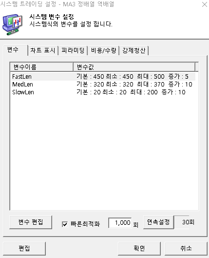 매매전략에 아래와 같은 3개의 변수에 대해 빠른 최적화 2회를 실시한다고 가정해 보겠습니다.