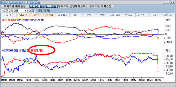 > 안녕하세요... 4102화면에서 외국인, 개인, 기관의 선물계약은 그래프와 지금 몇계약을 사고 팔고 있는지 숫자로 보여 주고 있어요.. 그런데 밑에 있는 선물최근월물과 미결제약정은 그래프만 나오고 숫자는 표기되지 않아 선물지수와 미결제약정을 알려면 또 다른 화면을 봐야해요. 특히 미결제약정은 파생상품 거래자들이 많이 참조하는 지표로 숫자가 안보여서 불편합니다. 선물계약수처럼 괄호 안에 숫자를 표시해 줄 것을 부탁드립니다.