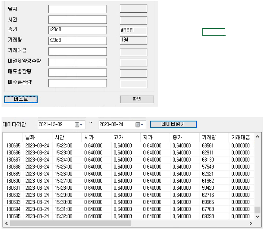 거래량은 누적으로 표시되는데, 틱데이터의 거래량을 누적해서 1분 데이터로 보여주기 때문에 테스트 화면과 차이가 발생되는 것으로 보입니다.