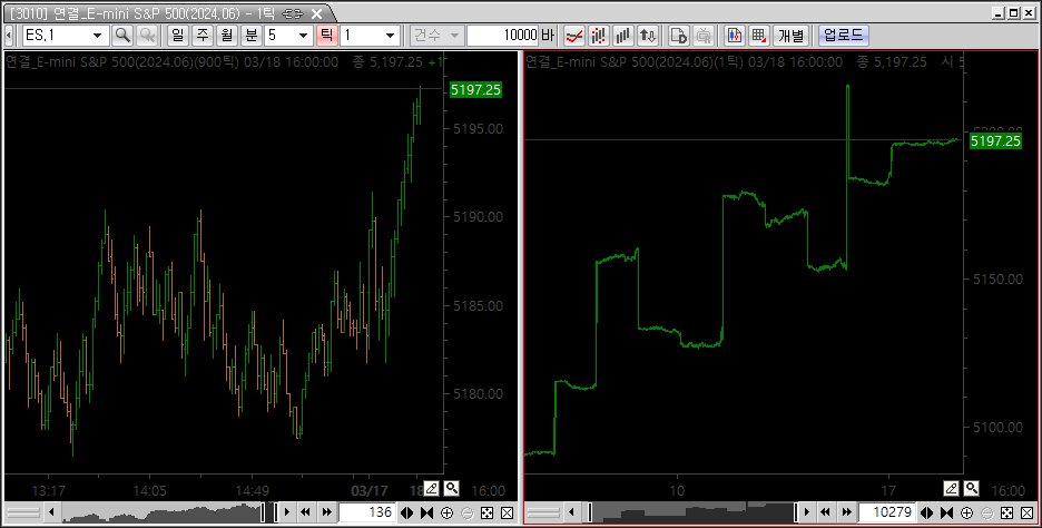 2. ES.1 900틱 차트와 1틱 차트에 최대치인 10,000개의 캔들을 불러오고 확인해본 결과