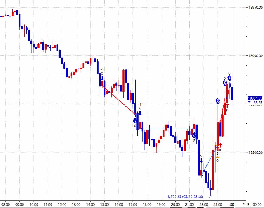 오전 5시에 당일청산과 매수진입이 같은 봉에 발생해서였는지 매수주문이 나간 것이 체결이 지연되면서 당일청산이 되지 않은 것으로 보여집니다.