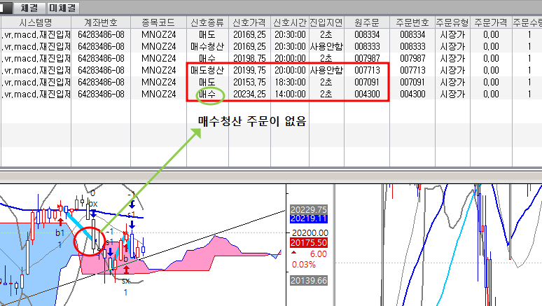 매수진입신호에 매수주문 체결이 되고나서 매수손절청산신호는 나왔는데 청산주문이 발생을