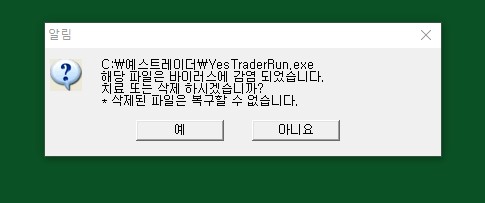 안녕하세요? 예스스탁입니다. 사용에 불편을 드려 죄송합니다. 현재는 문제가 해결되어서 더 이상 해당 메시지 발생되지 않습니다. 불편을 드린점 다시한번 사과 말씀 드립니다. 감사합니다. > 시세이도 님이 쓴 글입니다. > 제목 : 바이러스 메세지가 뜹니다 > 첨부한 것처럼 바이러스 메세지가 계속 뜨는데 어떻게 해야 하는지요?