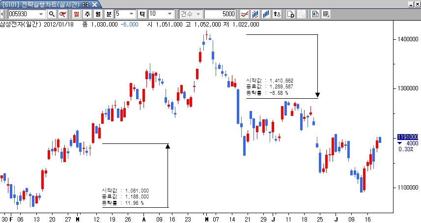 2) 차트툴을 위에서 아래로 그리면 오른쪽 처럼 하락 등락률이 구해져야 합니다.