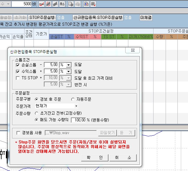 Stop의 가격기준(원)은 평가금액을 기준으로하지 않고 평균단가를 기준으로 하는데 가격수준이 서로 다른 종목들에 대해서 일괄적으로 '원'으로 설정하는 것은 의미가 없어서 %로만 설정할 수 있도록 하고 있습니다. 개별종목에 대해서 '원'으로 설정하시려면 보유종목 리스트의 왼쪽에 있는 '설정'버튼을 이용해서 나오는 'Stop주문 개별설정' 화면에서 설정하실 수 있습니다.